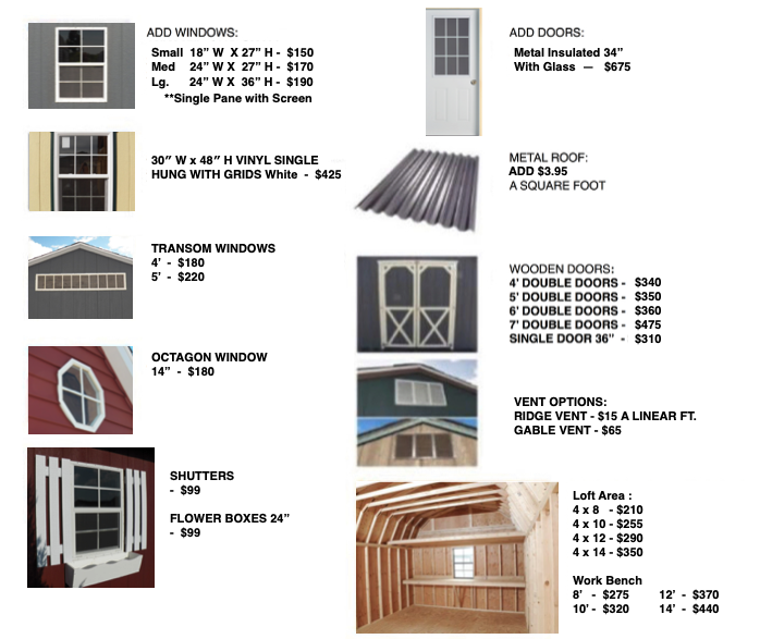 The options below are available on all our Storage Sheds and Portable Garages, Cabins, and Hunting Cabins. Each building comes standard with a door, window, 13 colour options, 30-Year shingles, and premium 50-Year Siding.